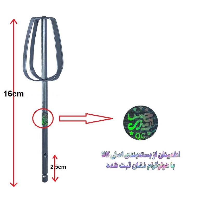 طول کلی این پره همزن حدود 16 سانتیمتر و فاصله خار حدود 2.5 سانتیمتر می باشد.
